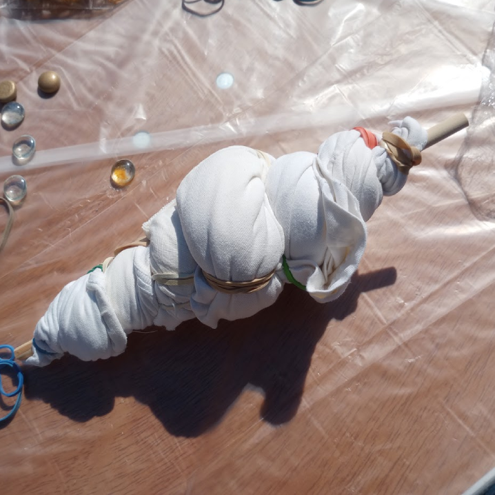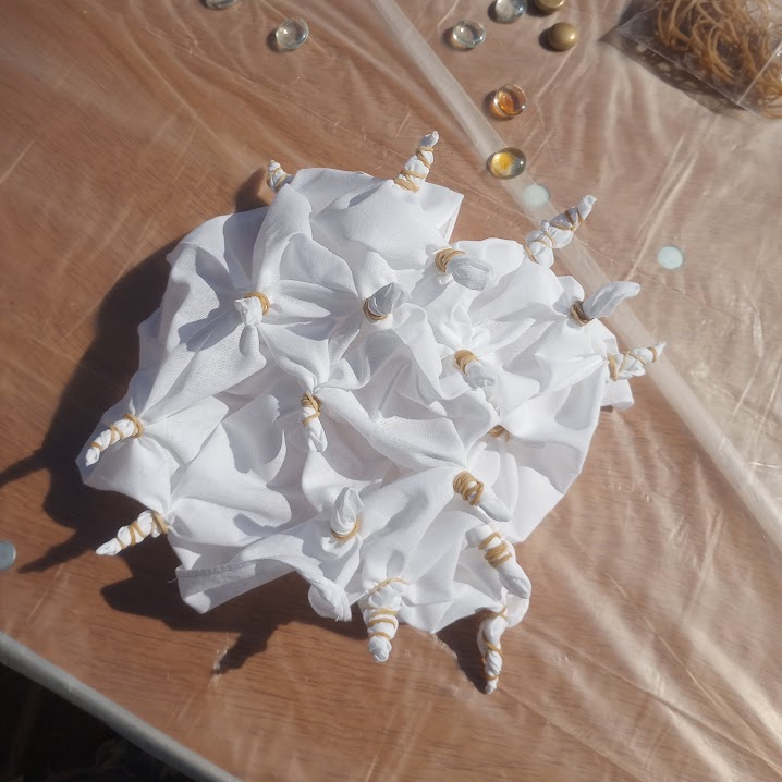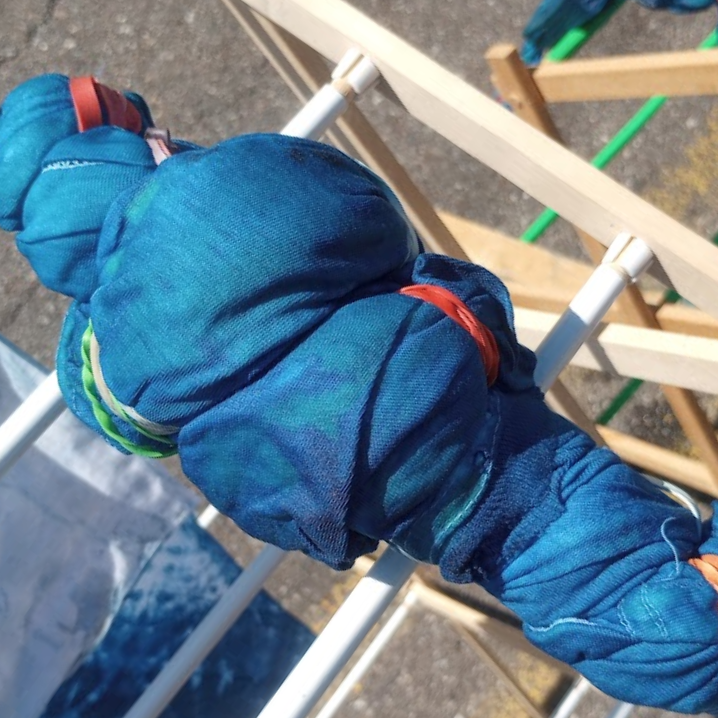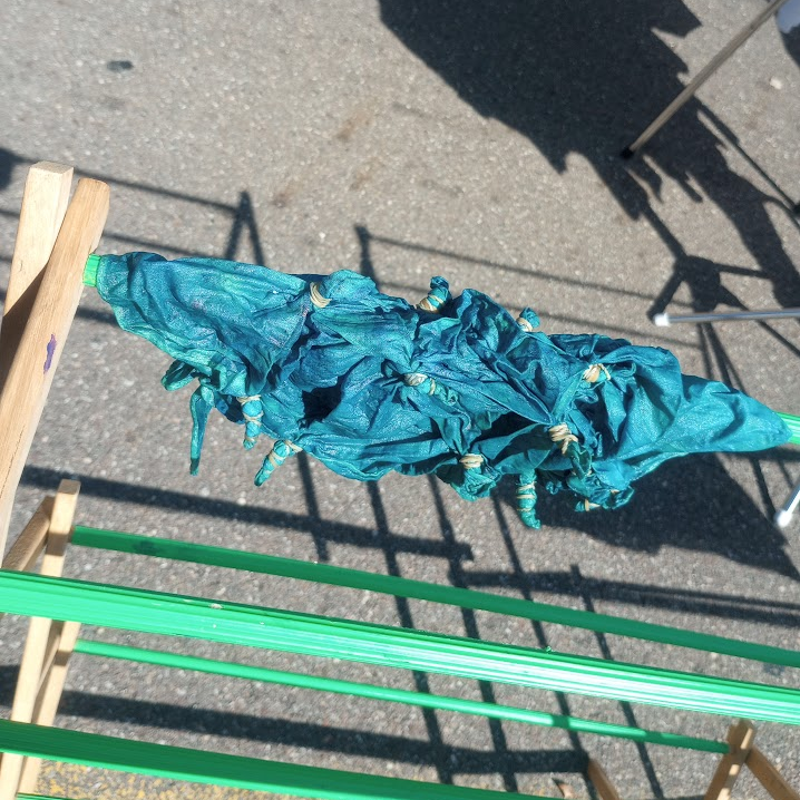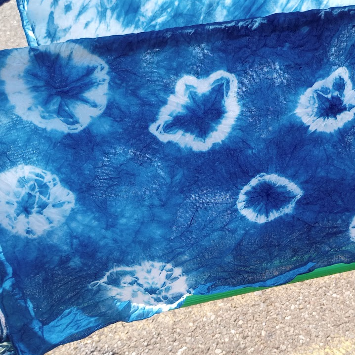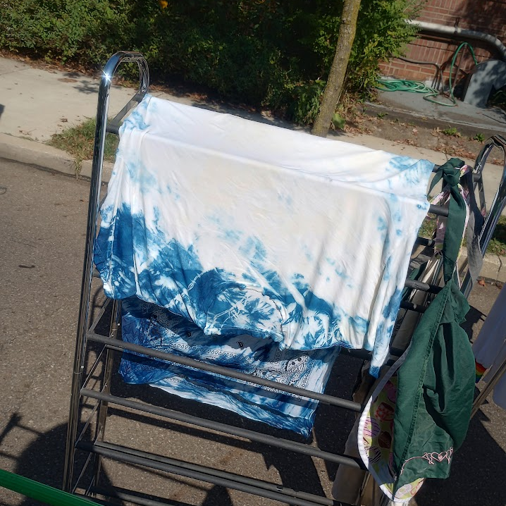 i did indigo dyeing! the folks running it were really nice (students from kent state and a local artist) and everyone tried different techniques on their items (we got a handkerchief and then another item we could pick from the stuff they brought, i did a baggy shirt as my second item). i'm always kinda surprised what DOESN'T catch the dye when you do stuff like this, and how much you kind of have to plot out what you're doing if you want it to look like something specific. i was going for a star with my handkerchief and tied off the points, but did not think to block out the center of the star (as though the dye would just magically know what i wanted and avoid those areas lol), so i ended up with a handkerchief with a bunch of circles (which tony joked looked like anuses jklghdfgld)